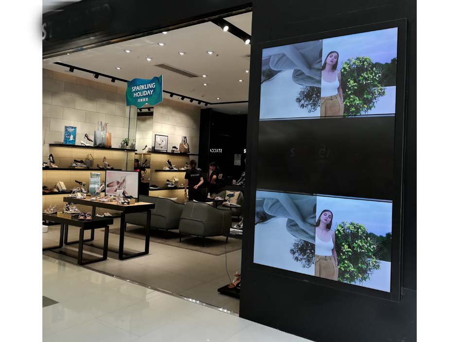 門店門口處,安裝拼接大屏或者掛式廣告機(jī),用于展示門店新品、模特服裝造型,吸引過往人群,同時提高門店形象。