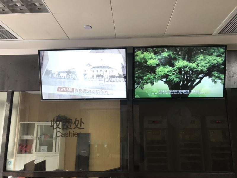 在收費(fèi)處柜臺(tái)懸掛壁掛廣告機(jī),用于醫(yī)院宣傳,患者排隊(duì)叫號(hào),減少人力,舒緩人流大導(dǎo)致的混亂。觸摸查詢機(jī),方便患者自助查詢就診信息,醫(yī)院門診科室。