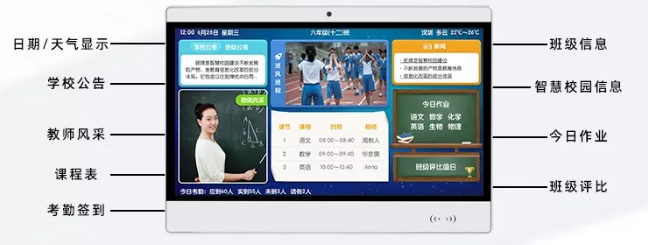 1.作為液晶顯示設(shè)備,電子門(mén)牌可以顯示:班級(jí)、專業(yè)、班徽,班級(jí)風(fēng)采展示圖,日期、天氣等;